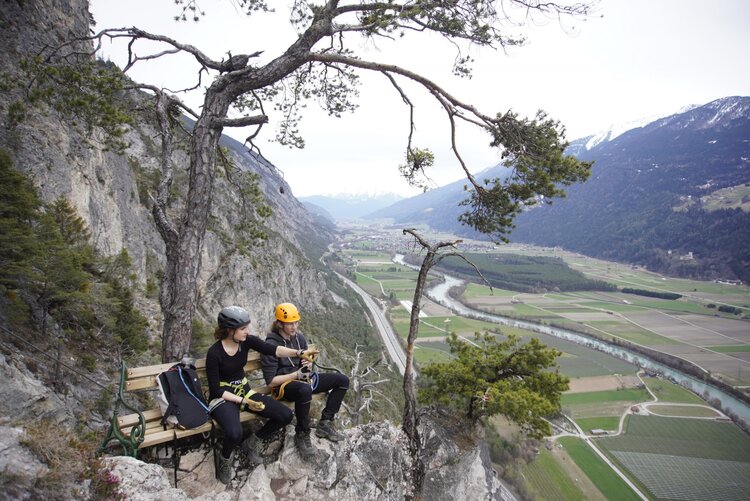 The Geierwand via ferrata near Haiming, just before the entrance to Ötztal, is one of the longest via ferratas in the Inntal valley. With its B/C rating, it is also recommended for more experienced via ferrata beginners. The steel cable winds its way up through many crossings and vertical passages. In the upper third, a bench invites you to take a break - including beautiful photos with the Inn Valley in the background. The absolute highlight of this via ferrata is definitely the rope bridge with a view of the Inn Valley!