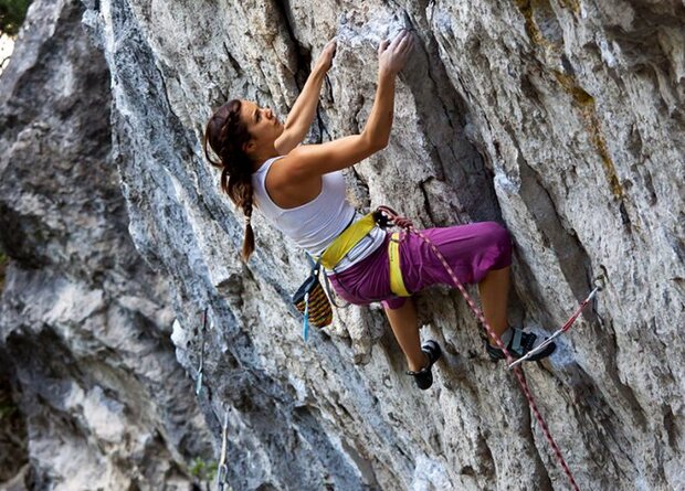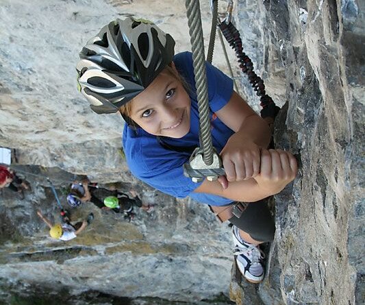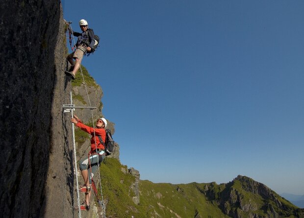 The first section is graded "D", i.e. difficult. If you already have major problems here, you should turn back. Otherwise, for the next 1.5 hours, you need to place your feet precisely on the wall, build up pressure and pull yourself powerfully upwards. The climb is very athletic, with some short "E" passages, making it very demanding. The arm muscles are really challenged.
