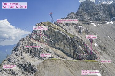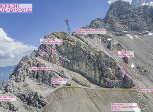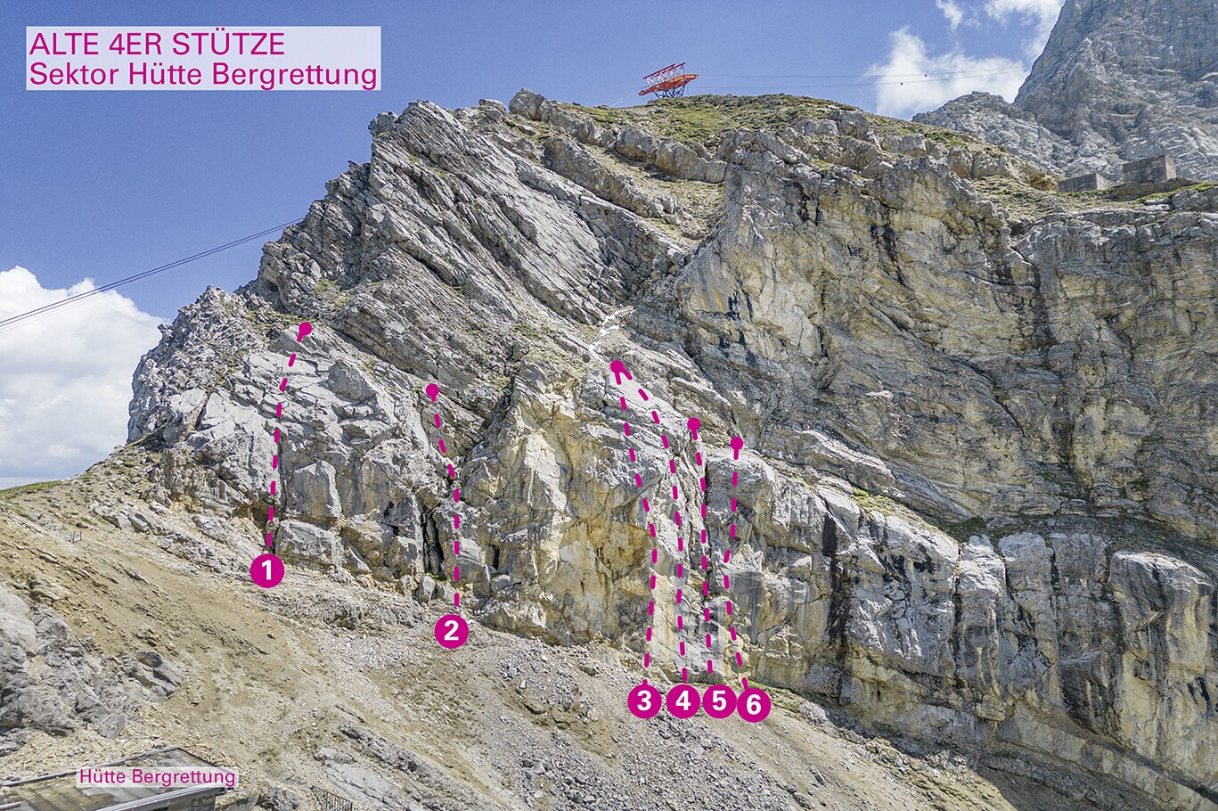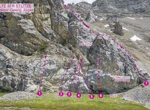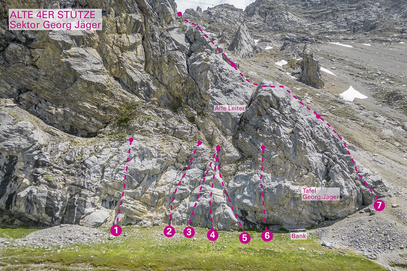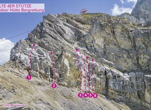The climbing garden is currently being expanded. In the end, we will have around 100 routes in this area. The approach is quite entertaining and leads up a moderately steep section, first along an old ski slope, then through mountain pines and finally through gravel. Even children can easily manage this as part of a day trip. At the top there is a fairly wide ledge where you can play and take a break. The panorama is overwhelming.
