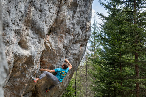 Der Breitlahner Wald ist vor allem im Sommer eine gute Adresse, denn durch die recht hohe Lage im Wald weht meistens ein angenehmer Wind und man findet fast immer brauchbare Bedingungen vor. Für den besten Grip ist jedoch die Übergangszeit zu empfehlen. Über die letzten Jahre ist das Gebiet immer mehr mit dem angrenzenden Bouldergebiet „Klausenalm“ zusammengewachsen. Wer mit den 90 Linien zu wenig bedient ist, findet bei der Klausenalm, nur wenige Gehminuten weiter, eine tolle Erweiterung mit ebenso spannenden Linien.