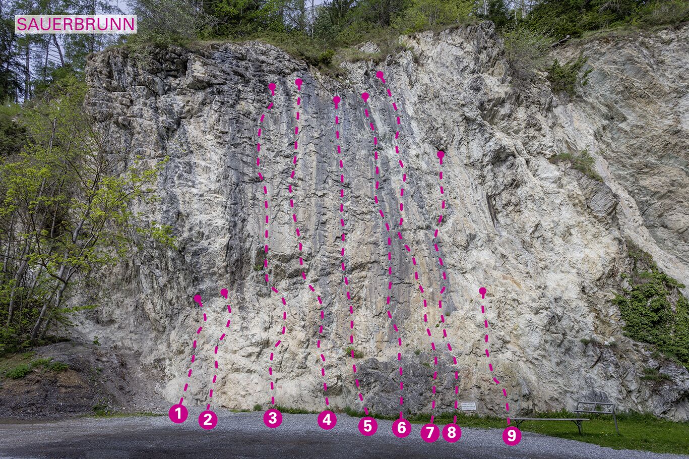 Die Griffe sind entweder in den Fels gebohrt oder "geflext". Die Kletterei ist vor allem für hallenerprobte Kletterer empfehlenswert. Der Klettergarten kann außerdem mit einer eigenen Mineralwasserquelle punkten. Der Sauerbrunnquelle werden besondere Wirksamkeiten nachgesagt. Der nahe gelegene Spielplatz und die einfacheren Routen machen ihn zu einem idealen Familienklettergarten.
