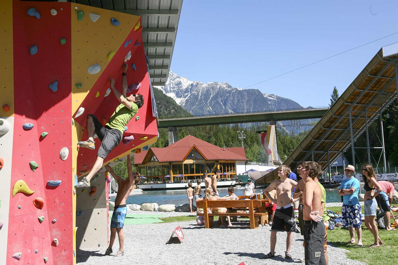 Sie haben mit „Climbers Paradise“ das wohl angesagteste Kletterdorado der Ostalpen geschaffen. Kletterexperte Mike Gabl und sein Team standen aber auch Pate für die Entwicklung der Climbing Area. Am Brückenpfeiler der Achbrücke schraubt sich ein 27 Meter hoher Vorstiegsbereich in Richtung Ötztaler Himmel – und damit die höchste künstliche Kletterwand Österreichs. Routen in allen Schwierigkeitsgraden garantieren vertikale Challenges der Extraklasse. Ergänzt wird das Ganze durch einen Boulder Cave am See. Und mit Sicherheit der Top-Spot für wasserfeste Kraxler: die Deep-Soloing-Boulderwand am Seeufer, Landung im Wasser inkludiert. Selten bereiteten Stürze so viel Vergnügen wie hier.