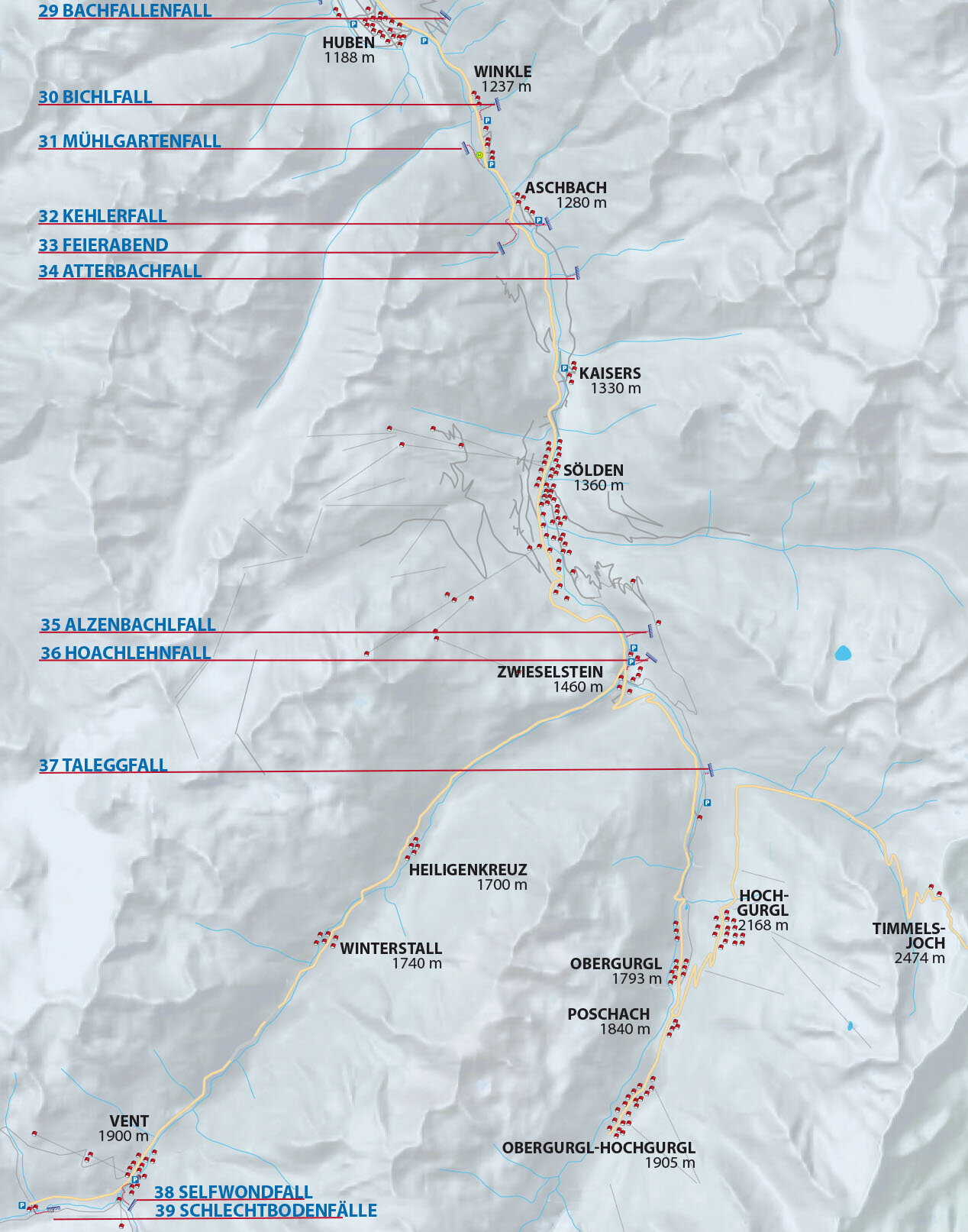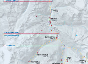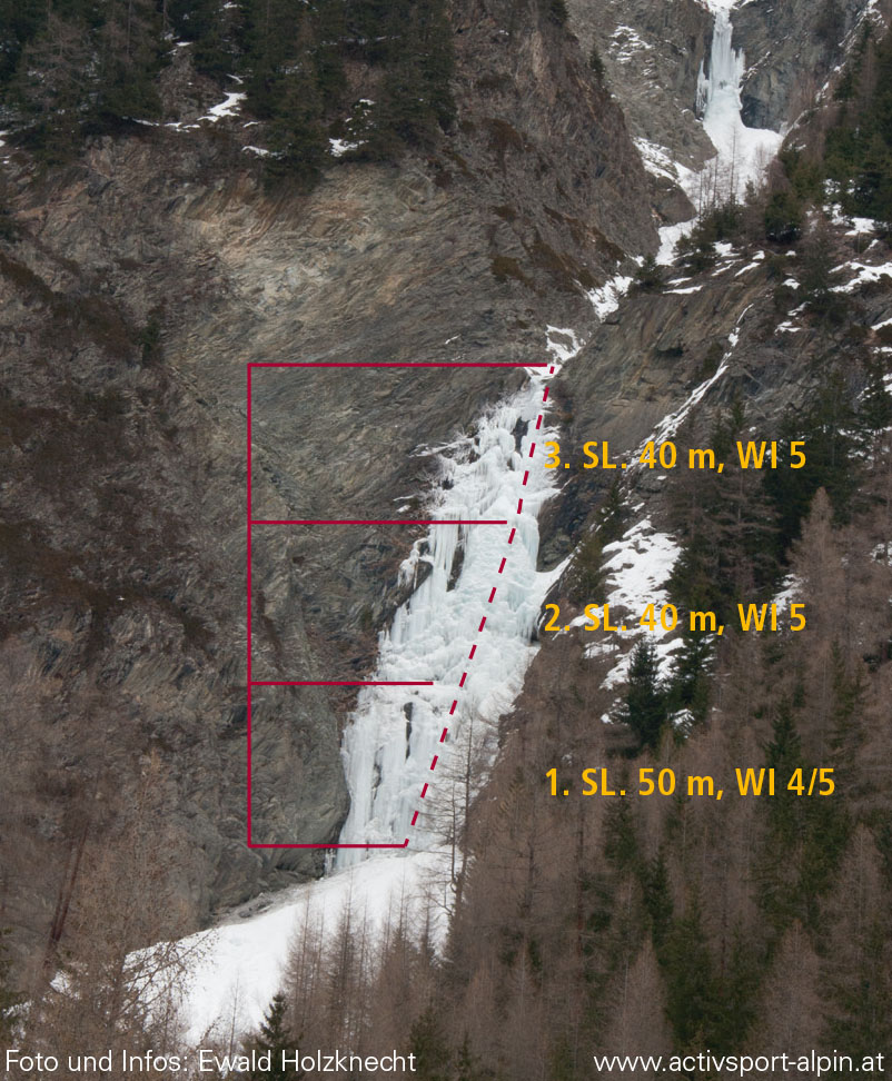 Oetz-Umhausen-Längenfeld-Huben-Winkle. Park After the Schotterwerk Scheiber (gravel mill/quarry) on the left side in the industrial zone or at the petrol station. Via the forest path to a wooden bridge and from there along the streambed up to the icefalls.