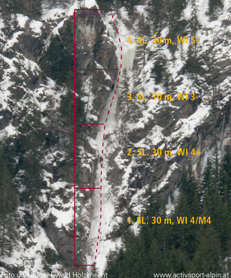 Oetz-Umhausen-Längenfeld-Huben-Aschbach. Turn right after the bridge at Aschbach and park at the barrier. From there you follow the driveway until a right turn where you go right and up through the woods until you reach the icefall.