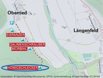Am Ortseingang von Längenfeld (von Norden kommend) beim Kreisverkehr rechts Richtung "Oberried-Lehn-Au" abbiegen. Geradeaus über die Brücke nach Oberried fahren.