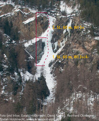 From Oetz via Umhausen to Längenfaled. After the village sign, take the first exit to the right in the roundabout towards "Oberried-Lehn". turn left at the bus station towards the Heimatmuseum (museum of local history) and then further along until you reach the parking space of the Lehner Wasserfall Klettersteig (via ferrata). Access to the entry of the via ferrata, shortly before the rope bridge of the via ferrata turn to the viewing platform and then through unmarked terrain up to the icefall.