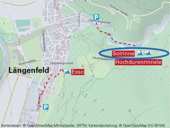 In Längenfeld (von Norden kommend) 50m nach der Touristinformation links in die Siedlung Klamm abbiegen und bis zu den letzten Häusern bei der Kapelle zum hl. Nepomuk fahren.