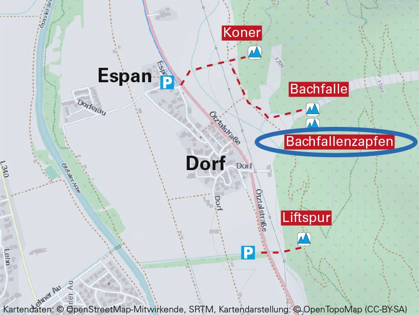 Beim Parkplatz die Bundesstraße überqueren und über die Wiese zum Waldrand gehen. Dort rechts am Waldrand entlang und über steile Hänge hinauf zum Eisfall gehen.