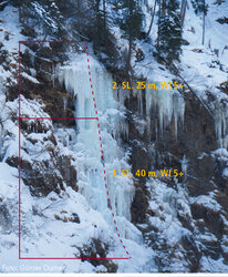 In Oetz at the roundabout turn left and drive for ca. 6,8 kilometres towards Küthai. Approximately 650 meters before the serpentines a forest road branches off to the left. Park there. From there walk across a bridge and then left along a forest path to the end of it. From there keep let and go up via a clearing to the icefall.