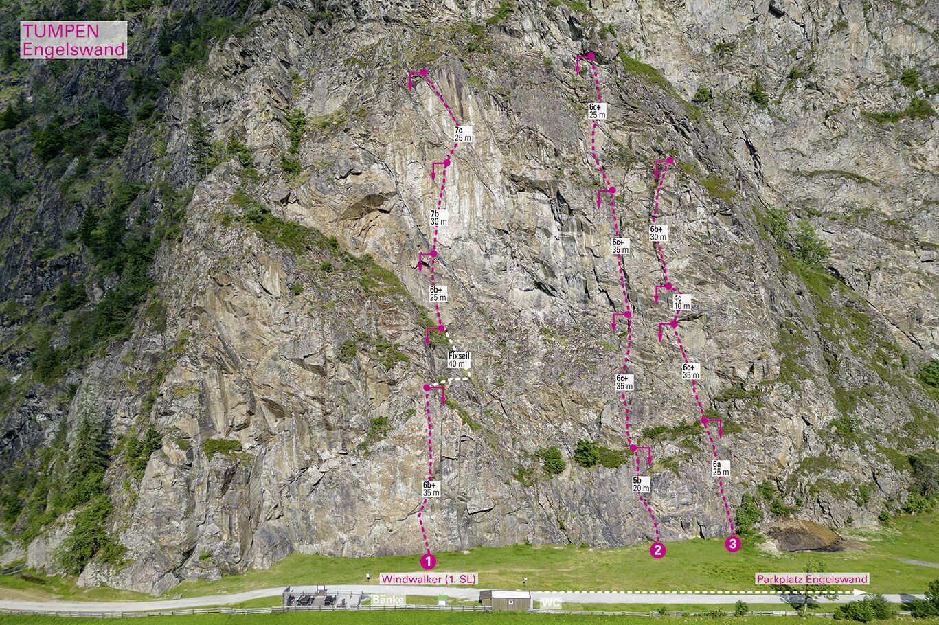There are 3 multi-rope routes at the Engelswand. However, be very careful, as there are people in the climbing garden below.