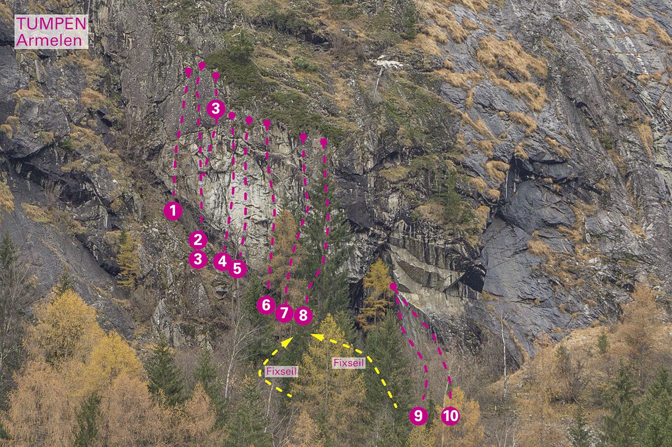 “Armelen” is only interesting for the climbing elite. There's nothing to get here under 7b. The “Black Swan” (8c) by Markus Haid is one of the hardest routes in the valley. The small climbing garden is only accessible from May. Ice fall can occur in spring due to ice melting. After rainfall, the wall remains wet and impassable for a long time. The access to the individual routes is sometimes difficult and not possible.