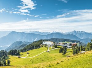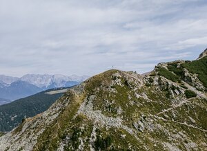 The descent route is not far from the summit. Via the south flank of Rosskopf you follow a marked hiking trail back to the top station of Acherkogelbahn gondola lift.