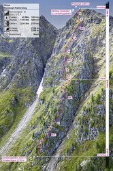Scenic Rosskopf Via Ferrata leads along the impressive north face of Rosskopf peak at 2.399 hm above sea level and offers a true alpine experience with awe-inspiring panoramic view of Ötztal valley. The route continuously features difficulty levels B to B/C and has varied passages with huge slabs, short steep sections and ridge crossings.