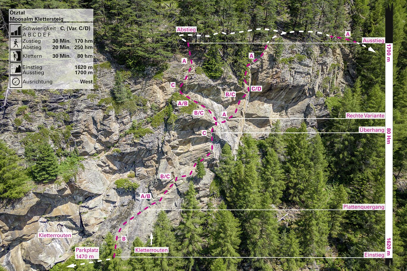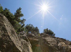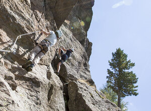 From the end of the wire rope, climb approx. 2 m up to a path. Keep right on this and follow climbing and wire ropes to a short, unsecured rock step. Go down the rock (1 m) and then through low thuja bushes on climbing tracks, immediately afterwards over a stepped steep meadow, past several climbing routes, back to the start.