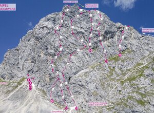Despite the popularity and the meanwhile good protection with bolts one should not forget that this is an alpine climbing area. The appropriate equipment is therefore mandatory!