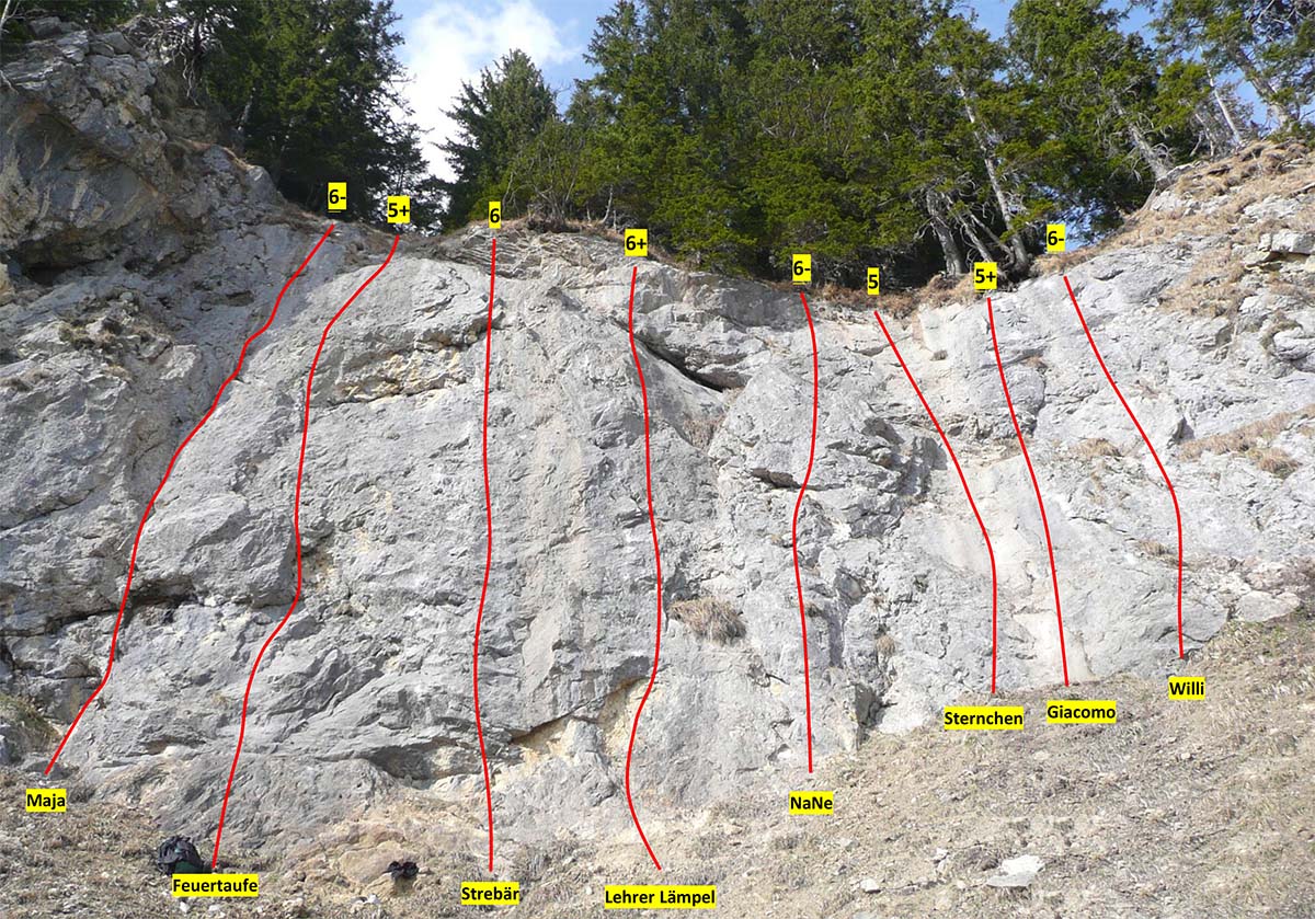 In the compact and about 20 meters high rock bar under the Gimpelhaus 8 sport climbing routes have been established so far. The difficulties are between 5a and 6a. The wall faces south and allows climbing almost all year round.