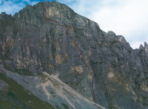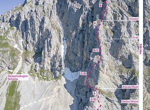 Attention: the descent is alpine ! - Climbs up to 1, partly exposed and brittle. Dangerous in snow and wet conditions (the snow lasts quite long on the north side in spring, information about the conditions at the Gimpelhaus or the Tannheimer Hütte).