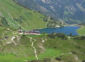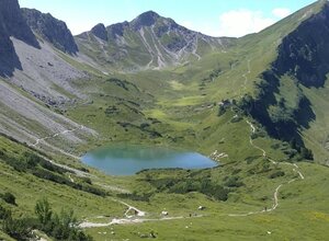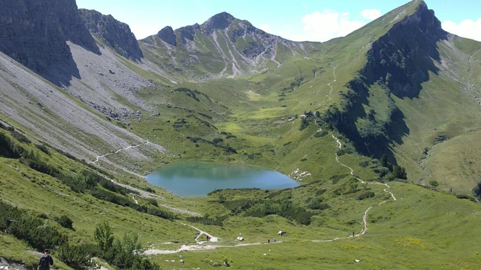 The starting point is Vilsalpsee or the Neunerköpfle valley station in Tannheim. From there over the Landsberger Hütte (1,805 m), it is about a 2.5–3 hour ascent to the entry at Lachesee. The path is marked and leads through beautiful alpine meadows into high alpine terrain.