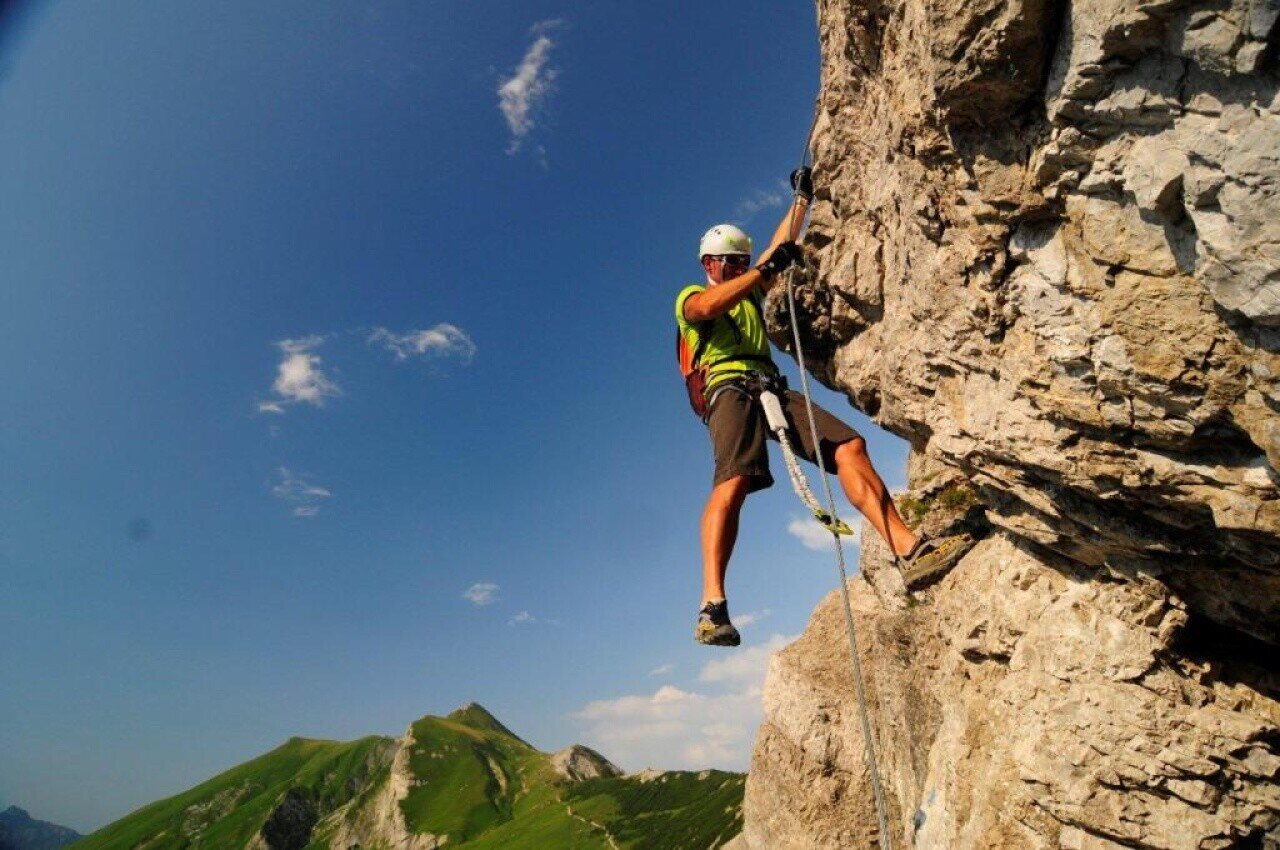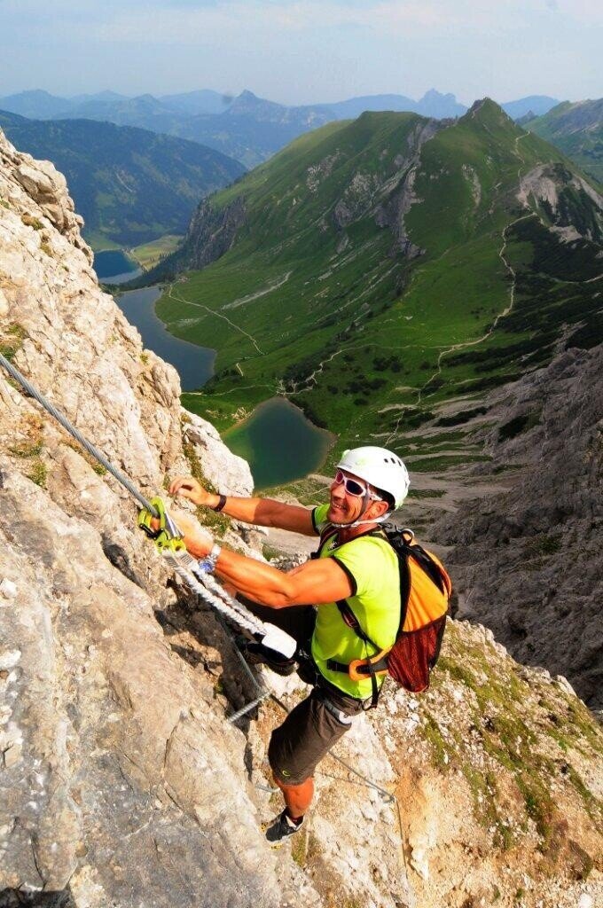 The via ferrata to Lachenspitze (2,123 m) in the Tannheimer Tal is a varied, mostly exposed route with a difficulty level of C/D. It leads over the southeast flank and offers fantastic views down to the turquoise-blue Lachesee. The route is very well secured and exposed – perfect for sure-footed and fearless climbers seeking an alpine experience.