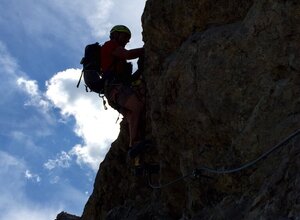 The via ferrata is well signposted and also very well secured. It takes about 2 hours to climb the via ferrata. The via ferrata has no emergency exit and has some exposed passages. The difficulty level is C with a few D passages or level 3 (of 6). The descent is via the marked normal route back to the Landsberger Hütte. There you can also rent some via ferrata sets.