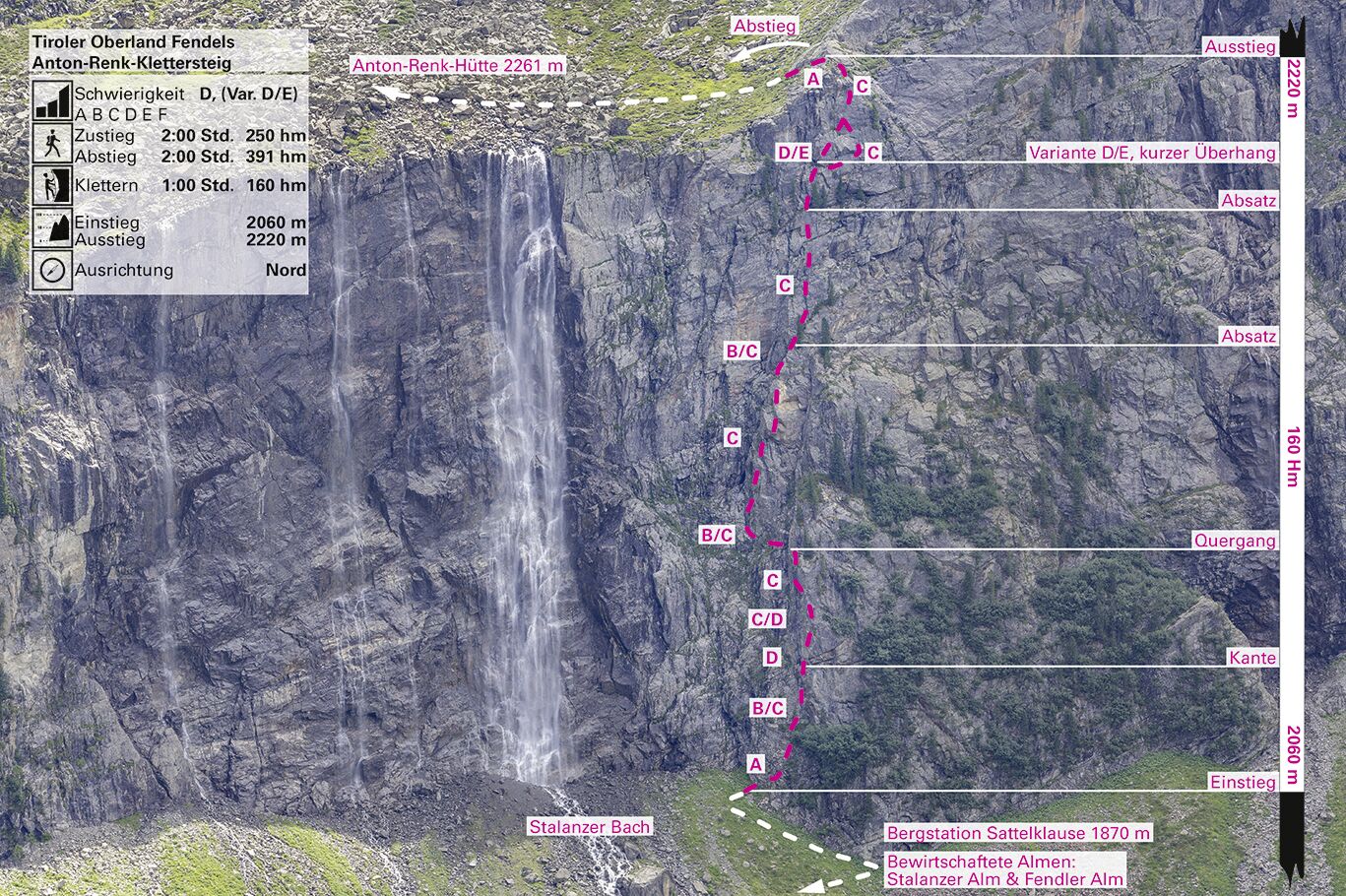 Zustieg: Von Fendels mit dem Lift zur Bergstation Sattelklause (1870 m). Vorbei an der Fendler Alm (1970 m) zum Zirmesköpfle. Einem schön angelegten Höhenweg zum Fissjochboden folgen. Ein neu angelegter Pfad führt hinunter zum Stalanzer Bach. Zuerst dem Bach folgen und dann rechts durch den Wald zum Einstieg des Klettersteiges (ca. 2100 m) hinaufgehen.