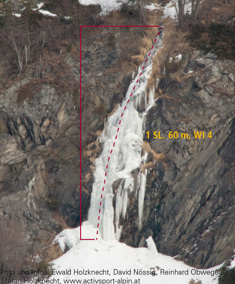 Kurzer, steiler Eisfall in der Nähe des Klärwerks. Kann auch Toprope beklettert werden. Kletterzeit: 45 Minuten Abstieg: 15 Minuten - über den Eisfall mittels Eisuhren und Bäumen abseilen.