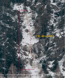 Kurzer Eisfall zwischen den Kletterfelsen des Klettergartens Oberried. Kletterzeit: 30 Minuten Abstieg: 10 Minuten - über den Eisfall mittels Eisuhren und Bäumen abseilen.