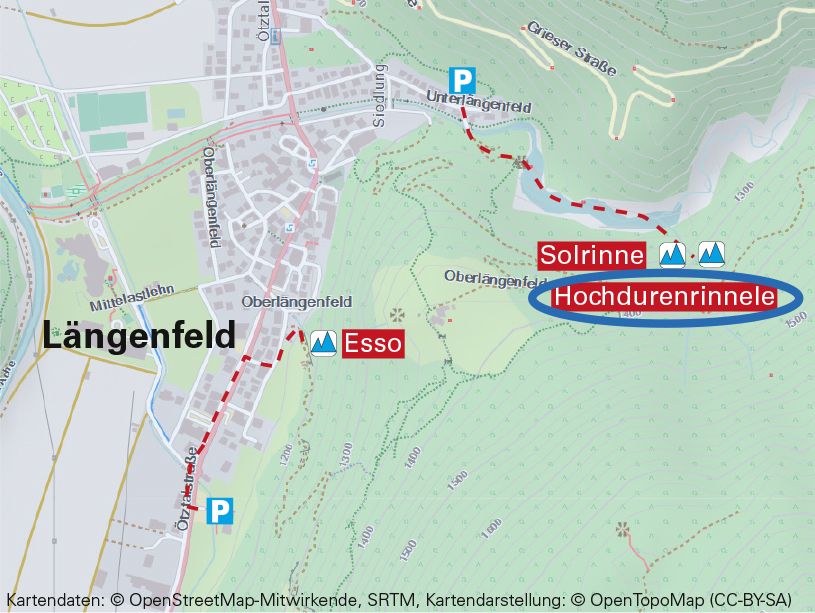 In Längenfeld (von Norden kommend) 50m nach der Touristinformation links in die Siedlung Klamm abbiegen und bis zu den letzten Häusern bei der Kapelle zum hl. Nepomuk fahren.