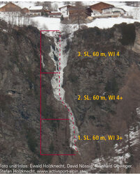 Mittelschwerer Eisfall mit einigen kurzen, senkrechten Stellen. Kletterzeit: 1,5 Stunden Abstieg: 30 Minuten - über den Eisfall mittels Eisuhren und Bäumen abseilen oder weiter bis zur Burgsteinstraße aufsteigen und dann auf der Straße bergab gehen.