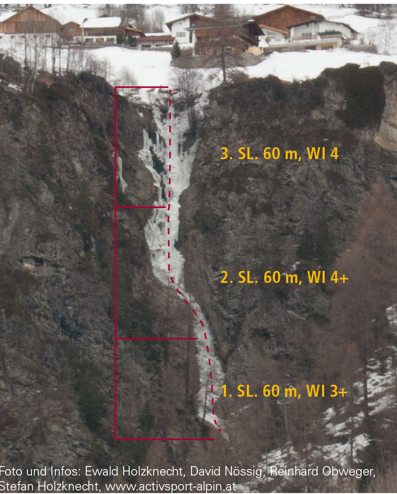 Mittelschwerer Eisfall mit einigen kurzen, senkrechten Stellen. Kletterzeit: 1,5 Stunden Abstieg: Über den Eisfall mittels Eisuhren und Bäumen abseilen (10 Minuten) oder weiter bis zur Burgsteinstraße aufsteigen und dann auf der Straße bergab gehen. (30 Minuten)