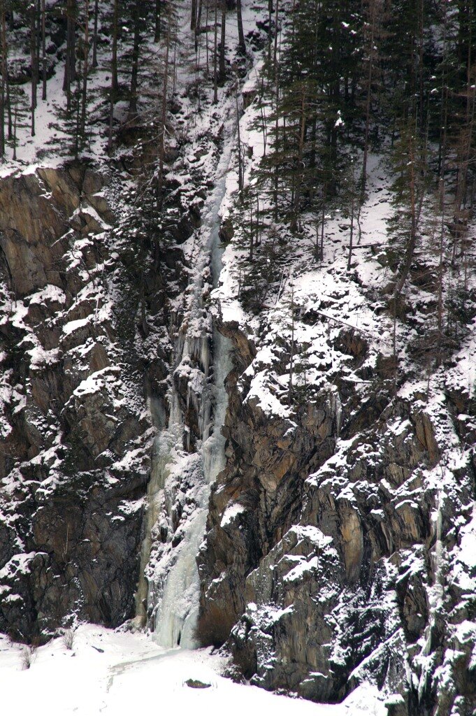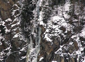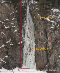 Kurzer Eisfall zwischen den Kletterfelsen des Klettergartens Oberried. Kletterzeit: 30 Minuten Abstieg: 10 Minuten - über den Eisfall abseilen (teilweise Bohrhaken).