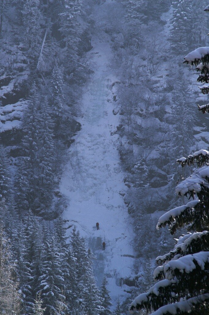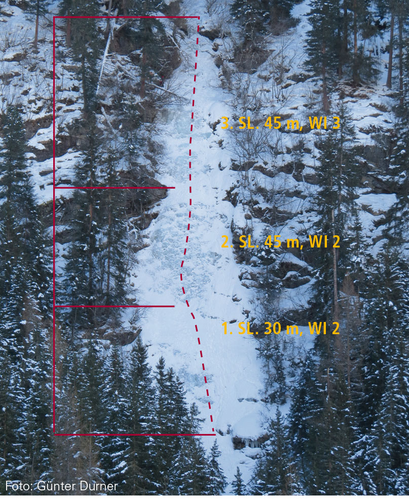 Schöner, einfacher, nicht allzu steiler Eisfall, der gut für Eiskletteranfänger geeignet ist. Hier gibt es gebohrte Standplätze zum Abseilen auf der orographisch rechten Seite.