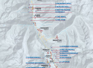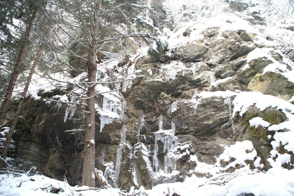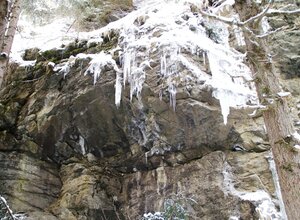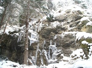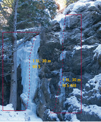 Sehr schöner, gut abgesicherter (Bohrhaken) Klettergarten um Mixed-Touren zu klettern. Abstieg: Absseilen über er den Eisfall mittels Eisuhren, Bäumen oder teilweise Bohrhaken - 10 Minuten