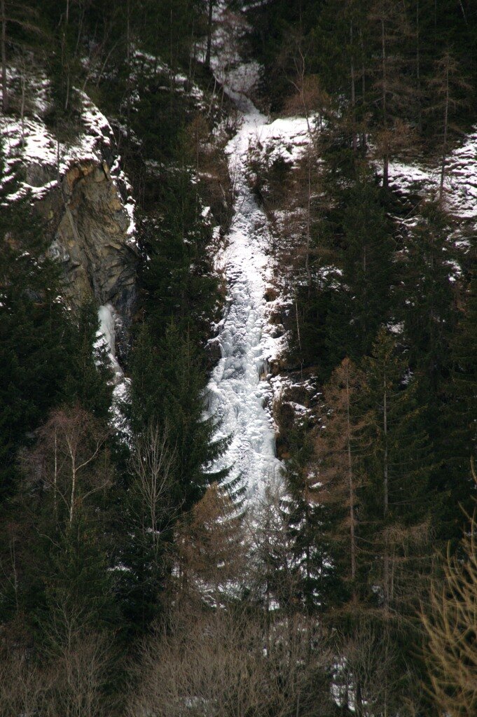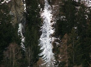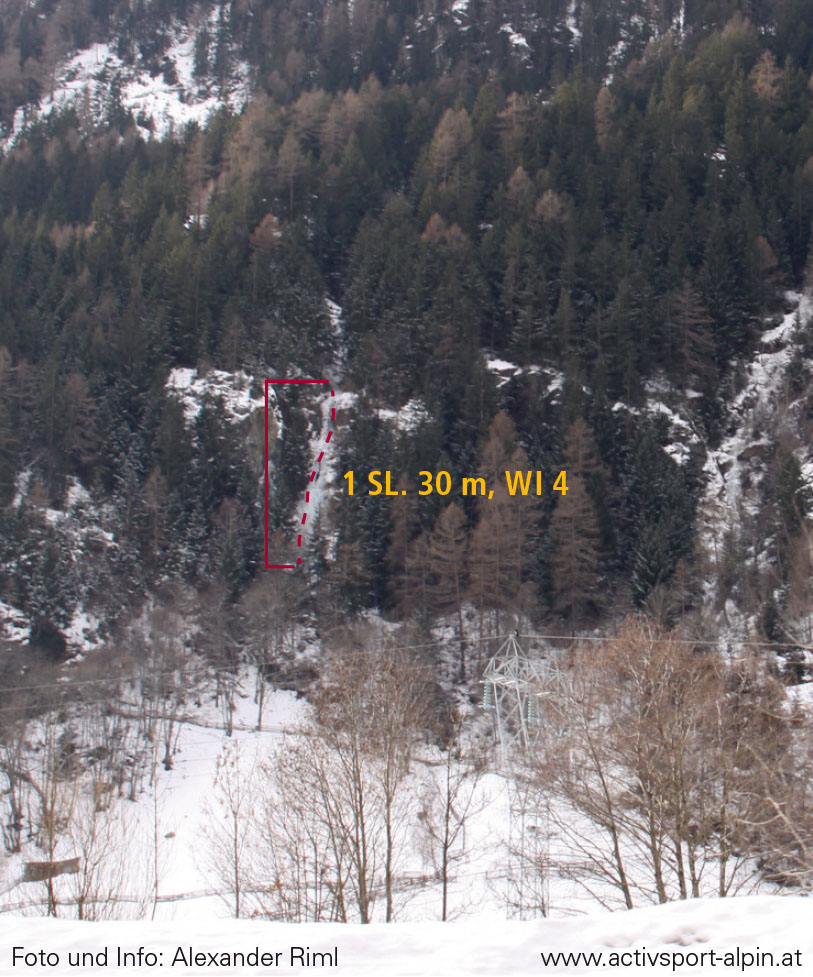 Kurzer, mittelschwerer und nicht allzu steiler Eisfall. Kletterzeit: 30 Minuten Abstieg: 20 Minuten - Abseilen mittels Bäumen und Eisuhren.