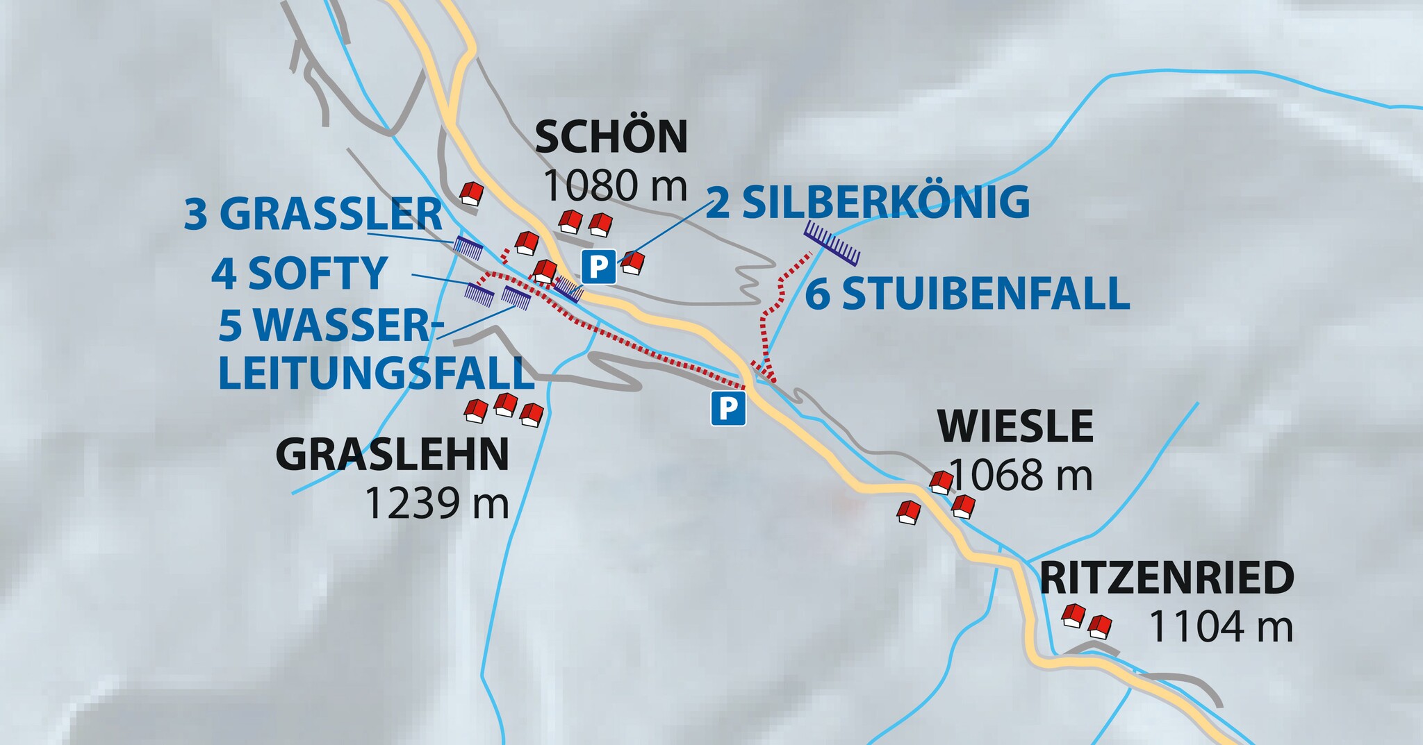 Drei extrem schwere, anspruchsvolle Eisfälle. Möglichkeit von Toprope. Seit einigen Jahren läuft vom Gasthof Schön fast kein Wasser mehr über die Wand, daher wenig bis kein Eis. Teilweise Mixedkletterei.